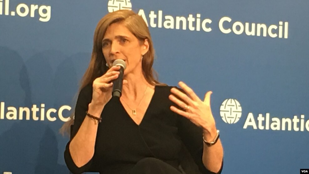 Duta Besar Amerika Serikat untuk PBB, Samantha Power, berbicara di Atlantic Council