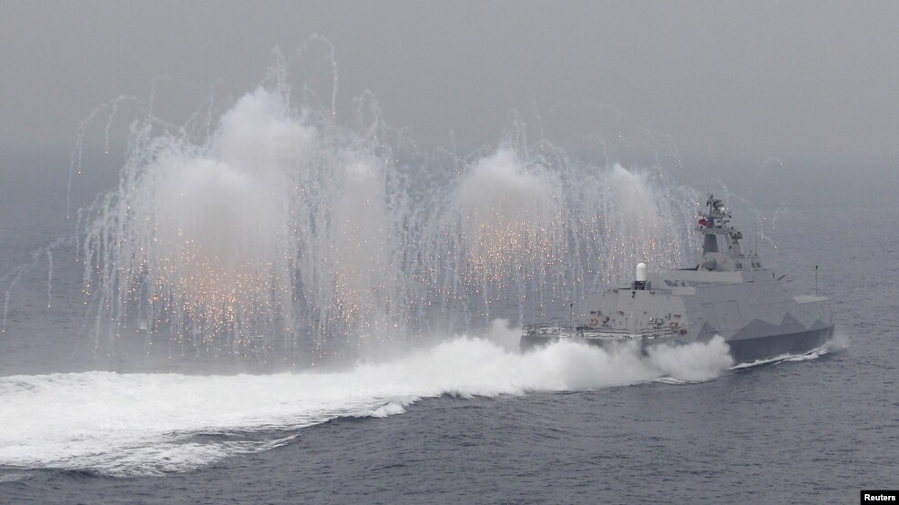 Lidah api (suar) terlihat disemburkan dari kapal pengangkut rudal milik angkatan laut Taiwan dalam latihan militer di luar pangkalan angkatan laut di pelabuhan Kaohsiung, Taiwan selatan, 27 Januari 2016. (Foto: dok).
