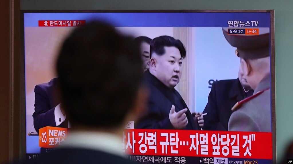 Seorang pria menyaksikan televisi yang menayangkan berita tentang pemimpin Korea Utara Kim Jong-Un, di Seoul Korea Selatan, April 5, 2017.